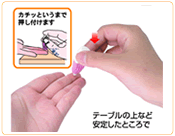 採血する指先をテーブルの上に安定させます。ラセット(針)を指で持ち、中指の指先に押しあてます。カチッと音がするまで押し付けます。音がしたら、すぐに離します。